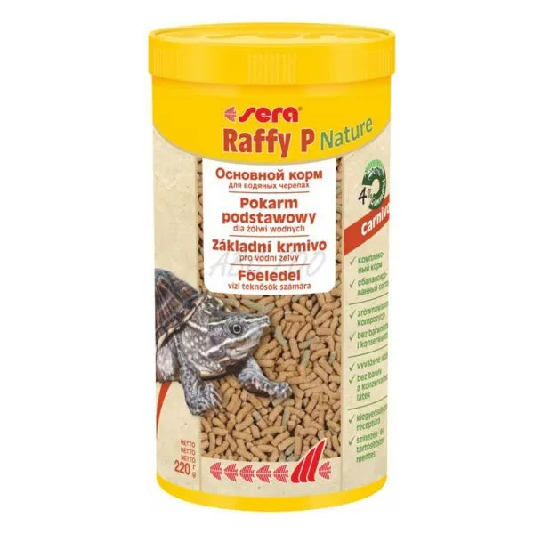 Sera raffy P - hrană granulată pentru reptile și broaște țestoase de apă. Acest tip de hrană conține toate ingredientele necesare, mineralele și vitaminele importante pentru o dietă sănătoasă.