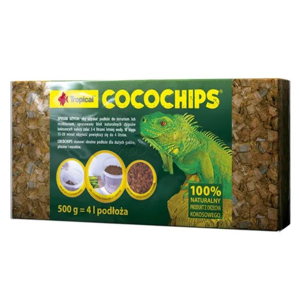 COCOCHIPS este o cărămidă,care este făcută prin compresarea şi uscarea nucilor de cocos.Înmuiaţi-o în 3 - 4 litri de apă înainte de utilizare.Astfel,veţi avea un substrat umed (aprox. 4 litri) pentru a fi folosit în terariu cu amfibieni sau reptile din pădurile tropicale. Poate fi folosit independent sau ca un supliment cu alte substraturi. COCOCHIPS este şi un component pentru substratul florilor exotice.