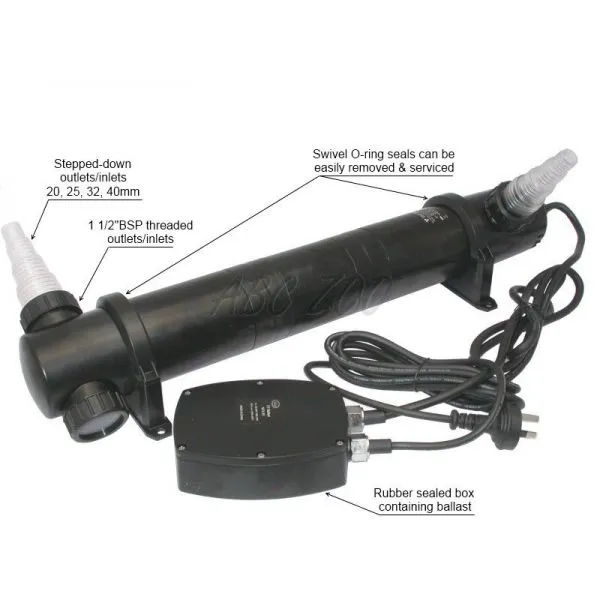 Foloseşte lumină UV - C pentru tratarea apei.Elimină eficace turbiditele cauzate de alge mici sau germeni, şi distruge germenii patogenici în apă, care previne bolile sa se dezvolte.Datorită funcţionării fizice pure a apei (lumină ultra violetă) nu încarcă apa cu chimicale.Nu este dăunător pentru flora bacterială folositoare dinăuntrul filtrului.Intrarea şi ieşirea apei sunt făcute pentru toate mărimile de furtunuri.