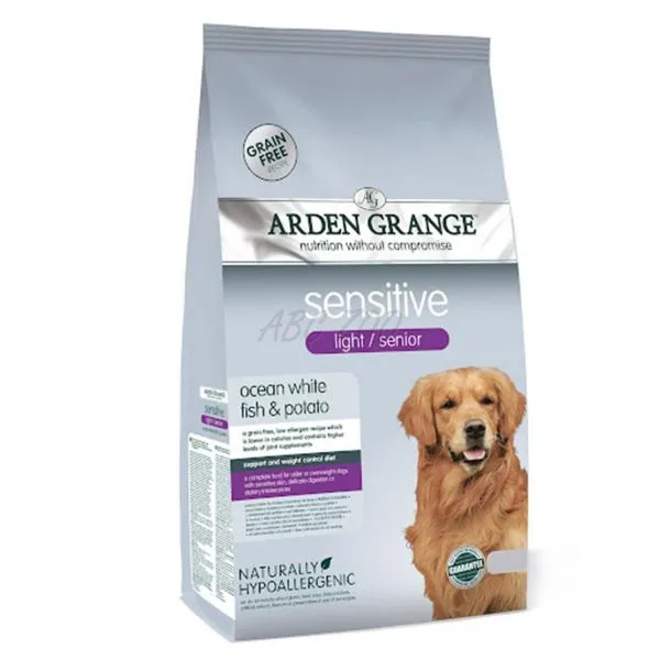 ARDEN GRANGE Sensitive light / senior este un aliment hipoalergenic natural fără cereale, pentru câinii mai în vârstă cu digestie supraponderală și sensibilă.
