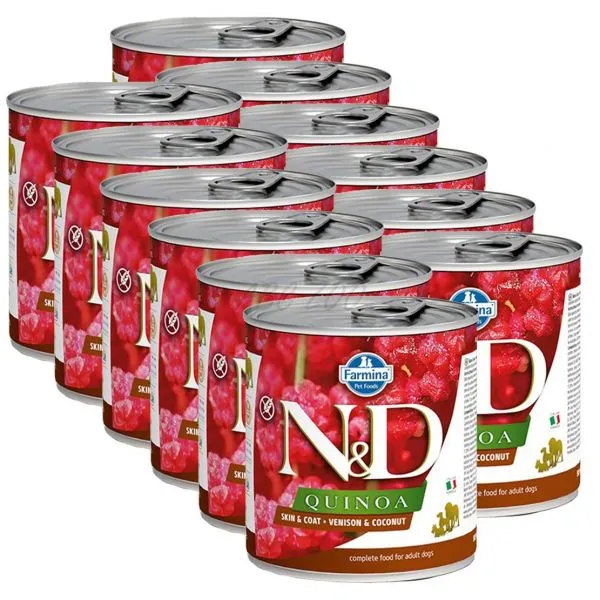 Farmina N&D este o hrană dietetică, fără cereale, la conservă, pentru câinii adulți de talie mică cu carne de vânat, quinoa și cocos, pentru a reduce intoleranța la anumite ingrediente și nutrienți din hrană.