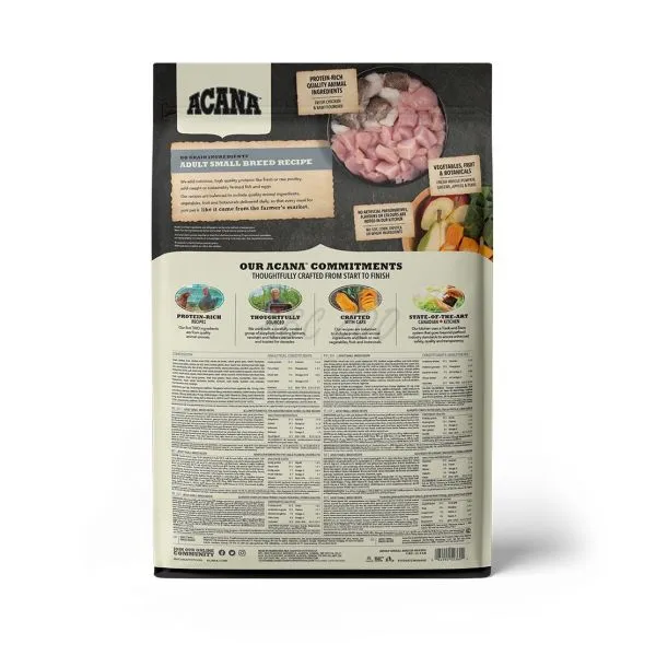 Acana Adult Small Breedis mâncare pentru câini fabricată din ingrediente proaspete, precum păsări de curte crescute în aer liber, ouă de la ferme în aer liber, cambulă sălbatică capturată din natură și fructe și legume coapte la soare. Toate aceste ingrediente bogate nutriţional fac mâncarea foarte gustoasă și să păstrează cîini de talie mică în stare de top.