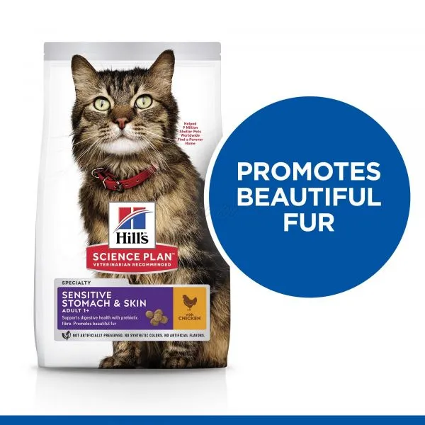 Hrana uscată pentru pisici HILL'S SCIENCE PLAN Sensitive Stomach & Skin asigură o sănătate digestivă optimă în timp ce hrăneşte pielea şi susţine frumusețea blănii.