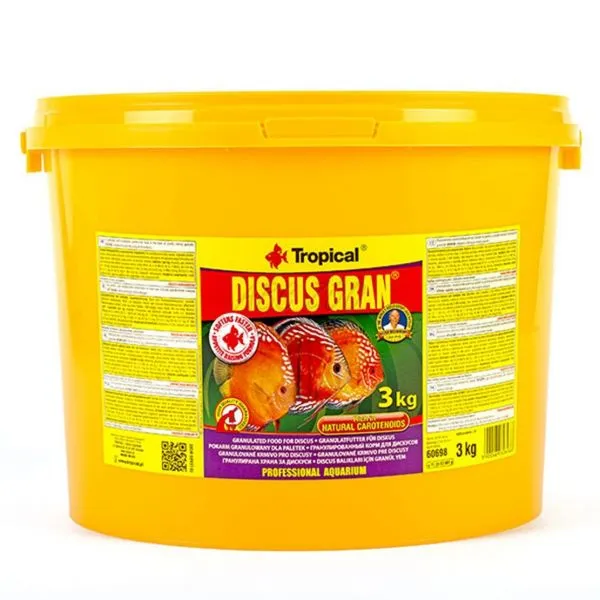 Proteinele de calitate înaltă și ușor de asimilat acoperă standardul nutrițional înalt al peștilor discus și susține creșterea, sănătatea și reproducerea acestora. Substanțele de bază de origine vegetală împreună cu algele Spirulina platensis ajută digestia peștilor și previn apariția constipației. Discus Gran este îmbogățită cu astaxantină naturală care intensifică colorația peștilor.