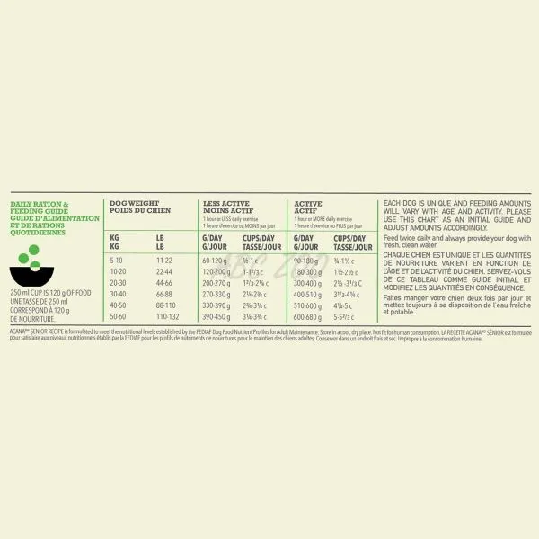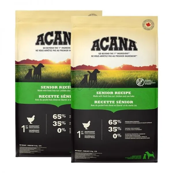 Acana Dog Senior 11,4 kg este o hrană completă pentru câini adulți cu vârsta de peste 7 ani. Hrana conține o cantitate mare de proteine pentru a sprijini masa musculara și o cantitate scăzută de zaharide pentru a preveni obezitatea și diabetul.