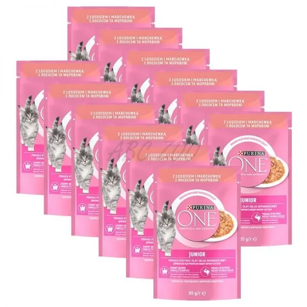 PURINA ONE JUNIOR mini filete cu somon și morcovi în suc 12 x 85 g