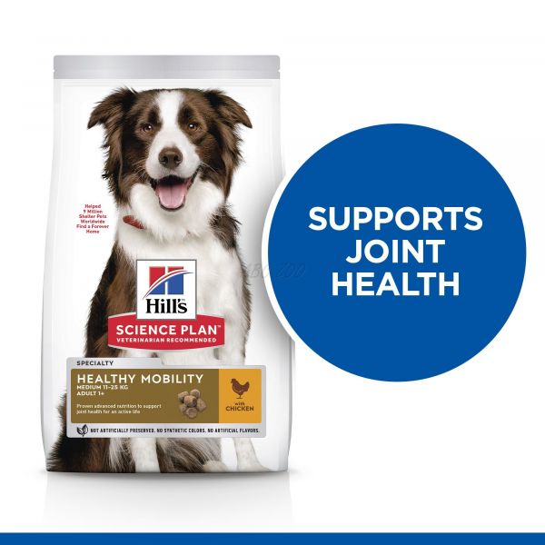 Hrana pentru câini HILL\'S SCIENCE PLAN Healthy Mobility Medium Adult cu pui este special concepută pentru a sprijini sănătatea articulaţiilor, pentru o viaţă activă.
