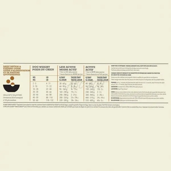 Ingrediente: carne de vită crudă (9%), miel crudă (8%), carne de porc crudă (8%), carne de vită deshidratată (8%), carne de miel deshidratată(8%), carne de porc deshidratată (7%), mazăre, linte roșie întreagă, năut întreg, grăsime de vită (5%), ficat de vită crud (4%), ficat de porc crud (4%), pește de lac de apă dulce crud* (4%), linte verde integrală, fasole pinto integrală, mazăre galbenă integrală, amidon de mazăre, bizon crud (2%), ulei de pește (2%), fibră de linte, ficat de miel crud (0,5%), burtă crudă de miel (0,5%), varec uscat, sare, carne de vită și ficat liofilizat, dovleac întreg proaspăt, morcovi întregi proaspeți, mere întregi proaspete, pere întregi proaspete, dovlecel întreg proaspăt, rădăcină de cicoare uscată, varză proaspătă, spanac proaspăt, napi proaspeți, sfeclă proaspătă, merisoare întregi, afine întregi, fructe de pădure întregi de saskatoon, turmeric, ciulin de lapte, rădăcină de brusture, lavandă, rădăcină de marshmallow, măceșe. *amestec variat de tullibee crude, pește alb, știucă de nord și chefin