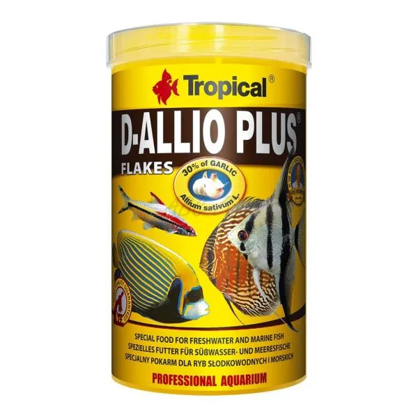 Fulgii D-Allio Plus conțin supliment de usturoi (Alium sativum L.)  sunt foarte apreciați datorită impactul lor benefic asupra organismului peștilor care rezultă într-un sistem imunitar rezistent și îmbunătățirea digestiei. Valoarea nutrițională ridicată, combinația bine echilibrată de vitamine și microelemente împreună cu proprietățile naturale ale usturoiului transformă această hrană în idealul pentru pești care se află sub tratament medical, de refacere sau obișnuirea cu un nou mediu.