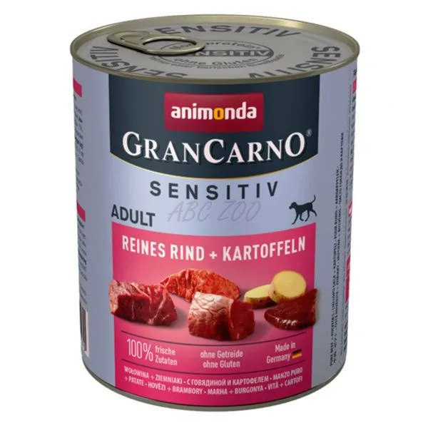 Animonda GranCarno Sensitiv Adult este o hrană la conservă cu carne de vită și cartofi pentru câini adulți de toate rasele cu digestie sensibilă.