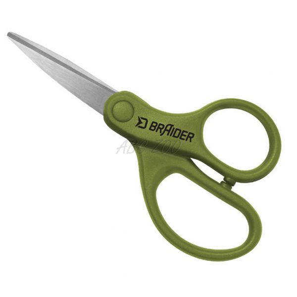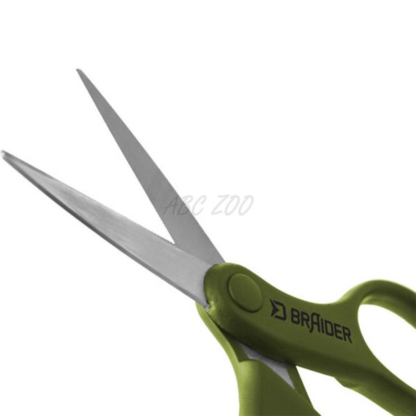 Mânerele foarfecilor sunt confecționate dintr-un material plastic verde pe care este prezent logo-ul Braider.
