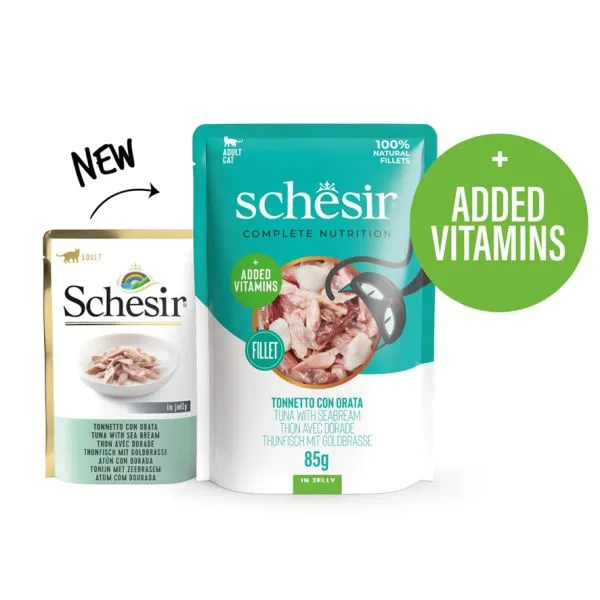 Pisica Schesir - Ton cu dorada este o porție de mâncare delicioasă sub formă de bucăți întregi de ton și dorada, completate cu orez sănătos.