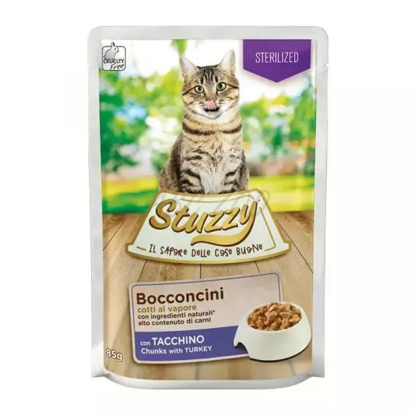 Stuzzy Cat Sterilized Chunks este o hrană completă pentru pisici sterilizate, preparată prin fierbere lentă, ceea ce o face și mai atractivă pentru pisici.