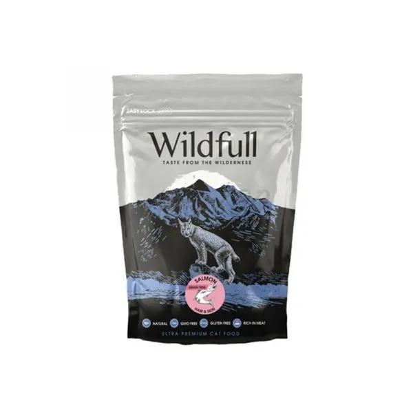 Wildfull Cat Adult Hair & Skin este o hrană naturală fără cereale, făcută din somon cu dovleac, care îmbunătăţeşte calitatea blănii şi a pielii de pisică.