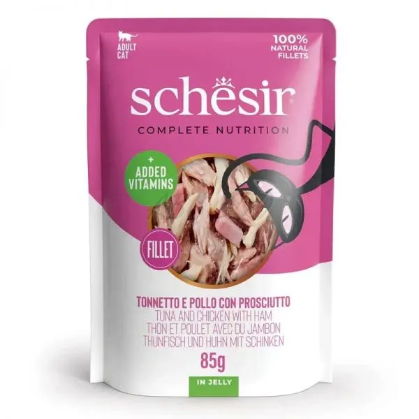 Schesir Cat- Fileuri de ton şi pui cu şuncă, este o mâncare delicioasă sub formă de bucăţi întregi de ton şi piept de pui, completate cu orez sănătos.