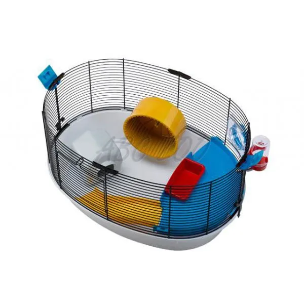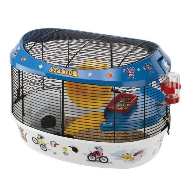 Cuşcă STADIUM oferă distracţie pentru hamterul sirian precum si pentru hamsterii adulţi. Echipamentele cu care este dotată cuşca satisfac nevoile de miscare al rozătoarei. Setul conţine si matriţe colorate. Pentru o mai usoară intreţinere si curăţire partea superioară a cuştii este demontabilă.