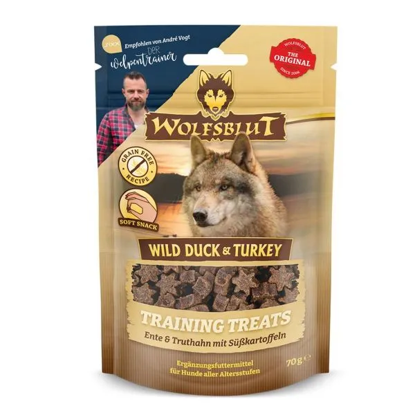 Wolfsblut sunt delicii moi de dresaj fără cereale și fără gluten, în formă de stea, pentru rase de câini de talie mică, cu rață, curcan, cartof dulce și sigiliul celebrului dresor de căței André Vogt.