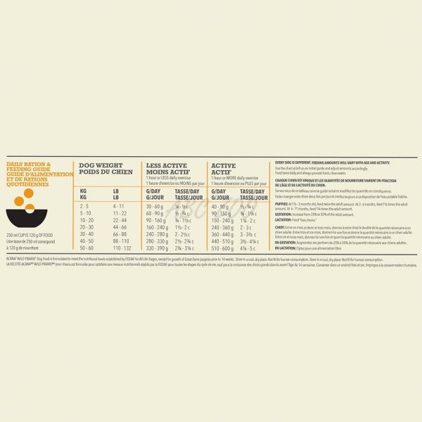 Ingrediente: pui proaspăt 11%, curcan proaspăt 9%, organe proaspete de pui (ficat, inimă, rinichi) 9%, pui deshidratat 9%, curcan deshidratat 6%, hering deshidratat 9%, mazăre verde întreagă, linte roșie întreagă, năut întreg, ouă întregi proaspete 4%, pește de lac de apă dulce crud 6%, grăsime de pui 4%, linte verde întreagă, fasole pinto integrală, mazăre galbenă întreagă, lulei de pește 2%, fibre de linte, alge marine uscate, dovleac proaspăt, dovleac pentru plăcintă, proaspăt, păstârnac proaspăt, varză proaspătă, spanac proaspăt, frunze proaspete de muștar, morcovi proaspeți, mere roșii proaspete delicioase, pere Bartlett proaspete, ficat liofilizat (pui și curcan), sare, merișoare proaspete, afine proaspete, rădăcină de cicoare, turmeric, ciulin de lapte, rădăcină de brusture, levănțică, rădăcină de hibiscus, măceșe, frunze proaspete de sfeclă, fructe de pădure întregi