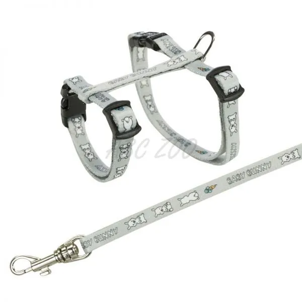 Ham cu lesă din nailon gri, inscripționat Baby Bunny şi model mic de iepuraşi. Lesa se prinde de ham cu carabină  iar mărimea poate fi reglată.