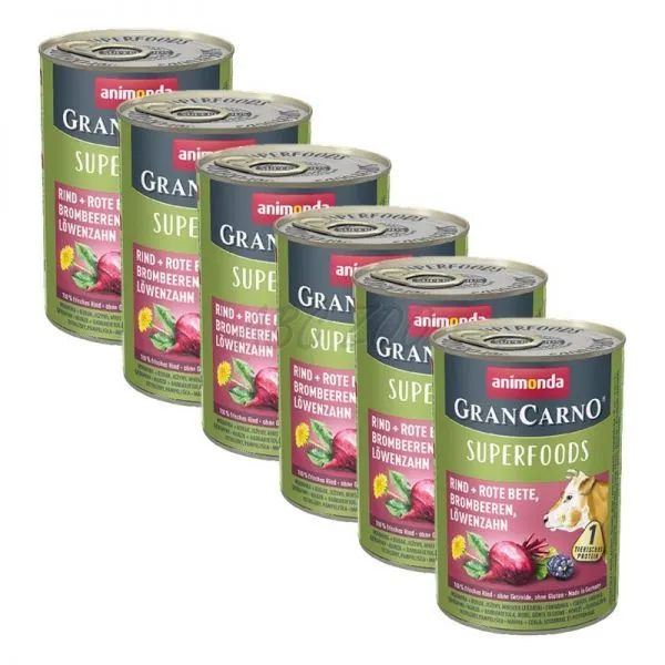 Animonda GranCarno Superfoods este o hrană la conservă, echilibrată cu carne de vită, sfeclă, mure și păpădie pentru câini adulți (1-6 ani) de toate rasele.