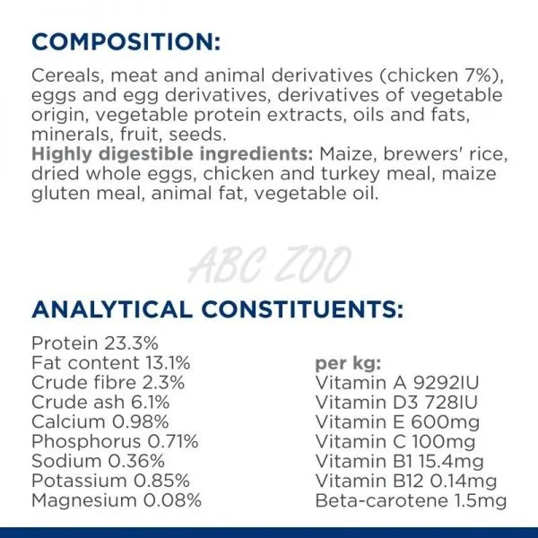 COMPOZIŢIE: Cereale, carne şi derivate animale (carne de pui 7%), ouă şi derivate din ouă, derivate de origine vegetală, extracte de proteine vegetale, uleiuri şi grăsimi, minerale, fructe, seminţe.