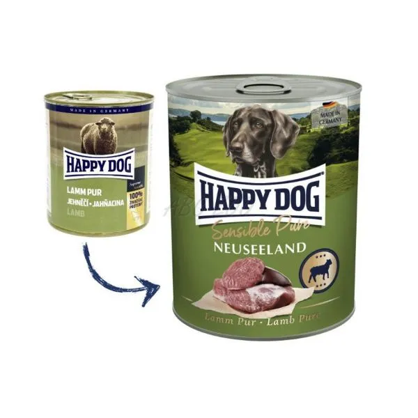 Happy Dog Lamm Pur Neuseeland este o conservă cu carne monoproteică, fără conținut de plante, cu adaos de vitamine.