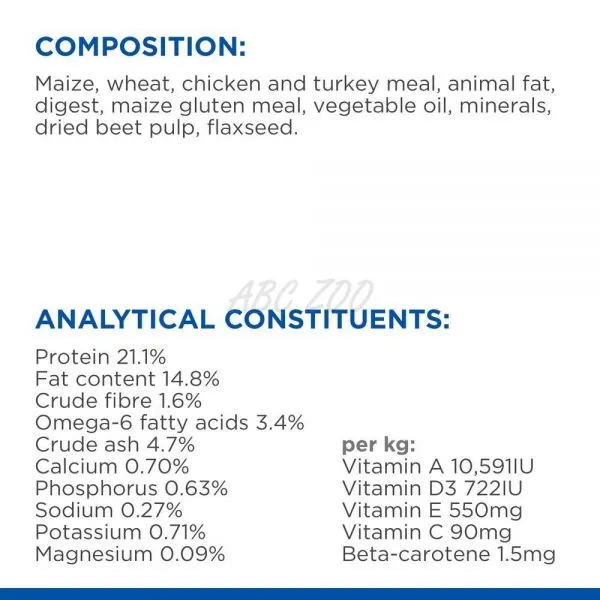 COMPOZIŢIE: Porumb, grâu, carne de pui şi curcan, grăsimi de origine animală, extracte proteice hidrolizate, făină de gluten de porumb, ulei vegetal, substanţe minerale, pulpă de sfeclă deshidratată, seminţe de in.