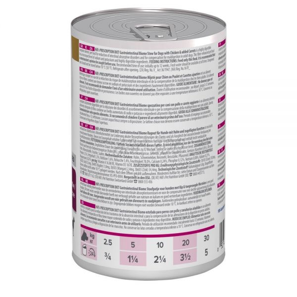 Hill's PRESCRIPTION DIET Gastrointestinal Biome Tocăniță Pentru Câini cu Pui și Morcovi adăugați este o hrană dietetică completă, uşor de digerat, pentru animale de companie, pentru reducerea tulburărilor de absorbţie intestinală şi pentru compensarea digestiei deficitare câinii adulţi. Această hrană pentru animale de companie cu nivel ridicat de fibre are un nivel crescut de sodiu şi potasiu şi ingrediente foarte digerabile.