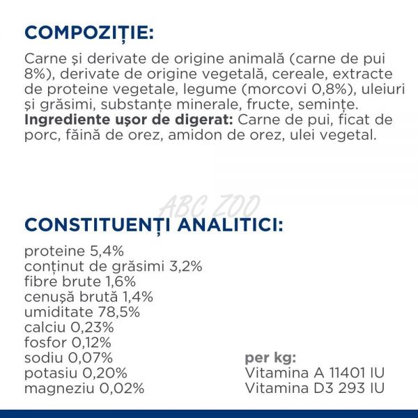 COMPOZIŢIE: Carne şi derivate de origine animală (carne de pui 8%), derivate de origine vegetală, cereale, extracte de proteine vegetale, legume (morcovi 0,8%), uleiuri şi grăsimi, substanţe minerale, fructe, seminţe. Ingrediente înalt uşor de digerat: Carne de pui, ficat de porc, făină de orez, amidon de orez, ulei vegetal.
