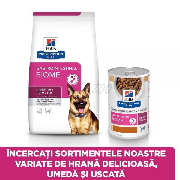 Hill's PRESCRIPTION DIET GI Biome hrană pentru câini conține tehnologia ActivBiome+, un amestec unicde prebiotice, dovedită clinic că ajută la creșterea fermității scaunelor moi în 24 de ore și reduce riscul de recurență. Este o hrană special formulată pentru a susține scaunele sănătoase și pentru a sprijini sănătatea digestivă generală. Această hrană pentru câini, bogată în fibre, susține un mediu urinar ce reduce riscul de a dezvolta cristale de struvit și oxalat de calciu. Această tocăniță irezistibilă are bucățele apetisante în sos și este făcută cu ingrediente delicioase, precum pui și morcovi, pe care câinele le va iubi.