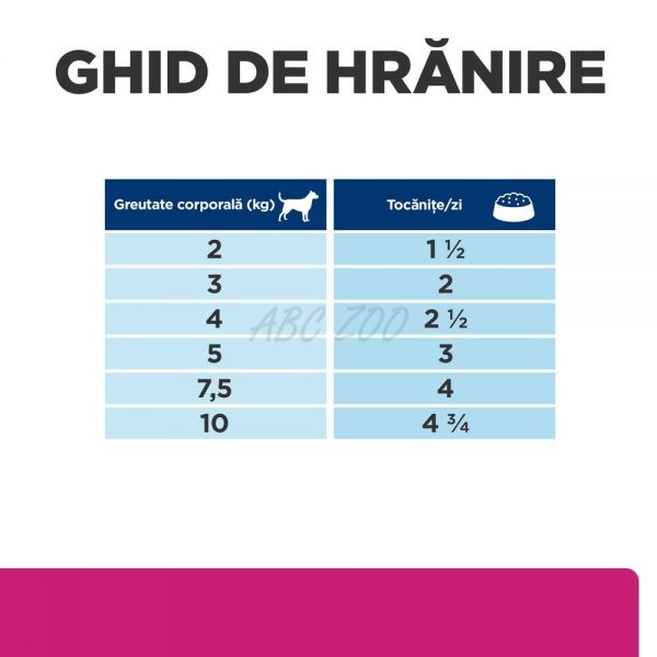 Adresați-vă medicului veterinar pentru instrucțiuni specifice de hrănire pentru animalul dvs. de companie. Recomandările zilnice de hrănire sunt doar un ghid și un punct de plecare. Gramajul este cea mai precisă formă de măsurare. Folosiți pentru prima data această hrană? Amestecați cantități tot mai mari din hrana nouă a animalului dvs. de companie cu cantități descrescătoare din hrana veche timp de 7 zile sau mai mult. Apa proaspătă trebuie să fie disponibilă în orice moment! Nevoile nutriționale ale animalului dvs. de companie se pot schimba pe măsură ce îmbătrânește. Întrebați medicul veterinar la fiecare control.