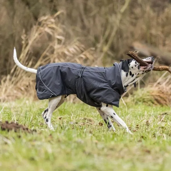 Calvi este o haină pentru câini cu două fermoare rezistente la apă pentru a se combina cu un guler sau ham.