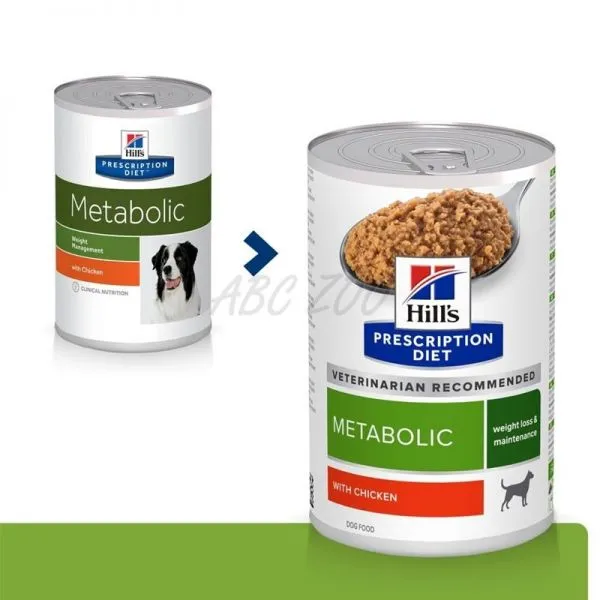 Nutriționiștii și medicii veterinari de la Hill's au formulat Prescription Diet Metabolic, o nutriție clinică special formulată pentru a ajuta câinii să piardă din greutate și să își mențină greutatea după slăbire. Funcționează în mod natural cu necesarul unic de energie al câinilor pentru o pierdere în greutate ușoară și eficientă. Această hrană stimulează abilitatea naturală a câinilor de a arde grăsimile și oferă energie pentru o joacă activă. Amestecul său unic de fibre ajută la menținerea senzației de sațietate a câinilor. Mai mult, 96% dintre câini au pierdut din greutate acasă în 2 luni atunci când au fost hrăniți cu hrana Metabolic.* Această hrană umedă este realizată cu pui și are un gust irezistibil pe care câinii îl adoră.
