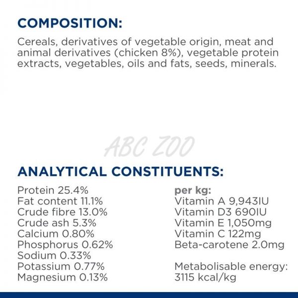 COMPOZIŢIE: Cereale, derivate de origine vegetală, carne şi derivate de origine animală (făină din carne de pui 8%), extracte de proteine vegetale, legume, uleiuri şi grăsimi, seminţe, minerale.