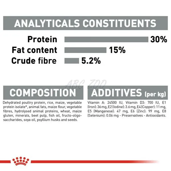 Ingrediente: Carne de pasăre deshidratată, orez, porumb, izolat de proteine vegetale (L.I.P. – proteină adăugată pentru digestibilitatea sa ușoară), grăsimi animale, făină de porumb, fibră vegetală, proteine animale hidrolizate, grâu, gluten de porumb, minerale, pulpă de sfeclă, ulei de pește, fructooligozaharide, ulei de soia, coji și semințe de psyllium.