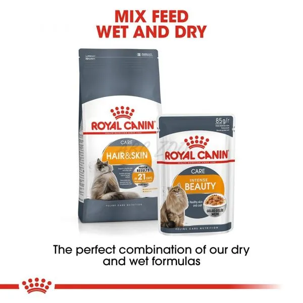 Alimentul ROYAL CANIN® Hair & Skin Care conține, de asemenea, o combinație esențială de acizi grași omega-3 și omega-6, care au un efect benefic asupra pielii și blănii. Compoziția acestui aliment include soia, ulei de borago (bogat în acid gamma-linolenic) și ulei de pește, rezultatul fiind o blană sănătoasă, strălucitoare și radiantă pentru pisica dumneavoastră. Granulele au fost create cu ajutorul unei game variate de nutrienți importanți, cum ar fi vitamina B, aminoacizii, zincul și cuprul. Acestea hrănesc pielea, blana și susțin funcțiile barierei cutanate. Ele asigură frumusețea optimă a pielii și, de asemenea, forța și densitatea blănii.