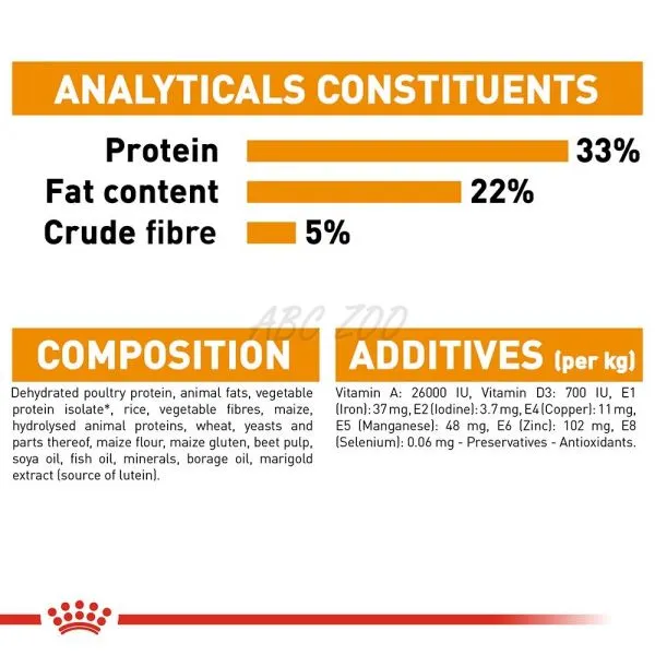 Compoziție: Carne de pasăre deshidratată, grăsimi animale, izolat de proteină vegetală (L.I.P. - proteină adăugată pentru digestibilitatea sa ușoară), orez, fibră vegetală, porumb, proteine animale hidrolizate, grâu, drojdii, făină de porumb, gluten de porumb, pulpă de sfeclă, ulei de soia, ulei de pește, minerale, ulei de borago, extract de gălbenele (sursă de luteină).