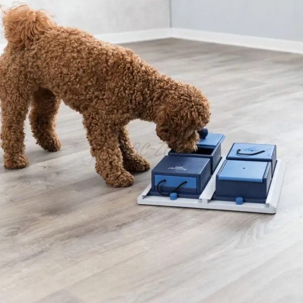 Tablă de joc cu multiple posibilităţi interesante. 4 module diferite. Câinele poate primi o recompensă folosind tehnici variate pentru a deschide cutia. Tabla de bază cu 4 compartimente este infdependentă. Jucăria include de asemenea picioare anti-derapante. Include o broşură cu sfaturi şi trucuri pentru ajustarea sau optimizarea antrenamentului.