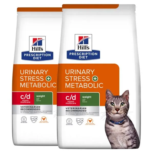 Similar cu cazul obezității la om, 55% din populația de pisici este supraponderală. Chiar și un mic surplus de greutate poate afecta calitatea vieții animalului, relația cu membrii familiei și, în timp, greutatea poate: reduce timpul de joacă, expune pisica la riscul de afecțiuni urinare, cum ar fi pietrele vezicii urinare și afectează negativ starea de sănătate generală pe tot parcursul vieții. S-a demonstrat că stresul are un impact negativ și asupra sănătății vezicii urinare.Nutriționiștii și medicii veterinari de la Hill's au dezvoltat hrana uscată pentru pisici Prescription Diet c/d Multicare Stress + Metabolic ca nutriție dovedită clinic special formulată pentru a gestiona sănătatea tractului urinar și greutatea corporală. De fapt, s-a demonstrat că hrana c/d Multicare Stress + Metabolic reduce rata de recurență a celor mai frecvente simptome asociate problemelor cu 89%, reduce greutatea corporală cu 11% în 60 de zile și conține ingrediente care ajută la gestionarea stresului.