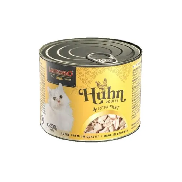 Leonardo este hrană conservată pentru pisici cu conţinut mare de carne şi bucăţi de file extra delicioase.