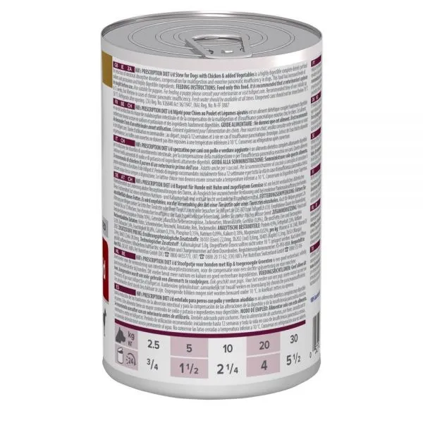 Hill's PRESCRIPTION DIET i/d Stew pentru câini cu Pui și Legume adăugate este o dietă completă, foarte ușor de digerat, pentru reducerea tulburărilor de absorbție intestinală, compensare în cazurile de maldigestie și insuficiență pancreatică exocrină la câini. Această hrană conține niveluri ridicate de sodiu și potasiu și ingrediente ușor de digerat.