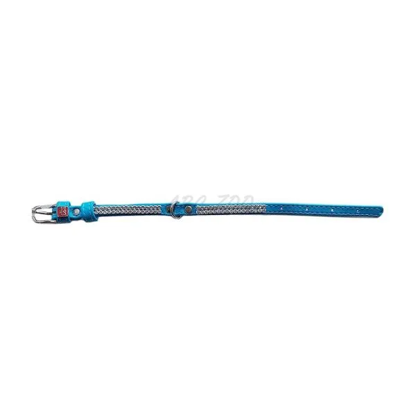 Zgardă din piele lucioasă de culoare albastră deschis cu pietre de cristal, lungime de 19 - 25 cm, lățime de 9 mm.