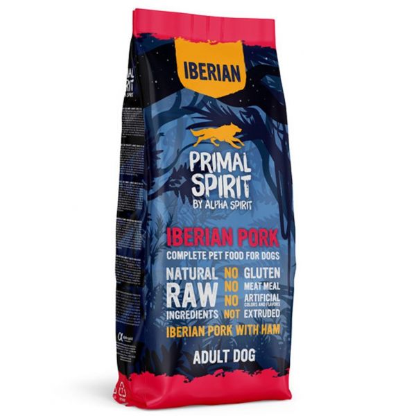 Primal Spirit Dog este o hrană sănătoasă unică pentru toate rasele de câini adulți, cu un conținut ridicat de carne de porc iberic și șuncă Serrano spaniolă, suplimentată cu orez hidrolizat.