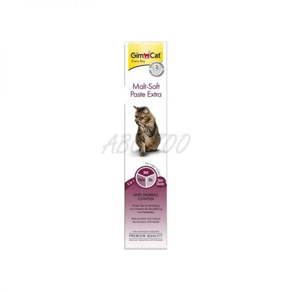 GimCat Malt Soft Extra Paste Anti hairball complex are un triplu efect - favorizează eliminarea părului mat, ajută la reducerea formării de smocuri de păr și ajută la prevenirea tulburărilor digestive.