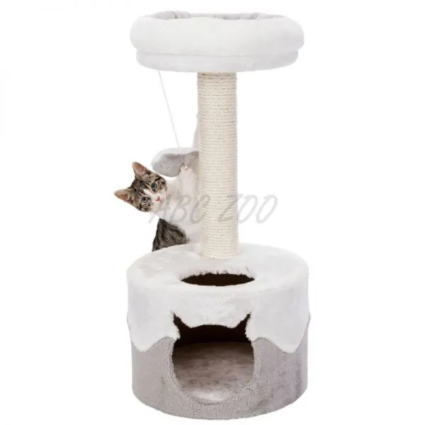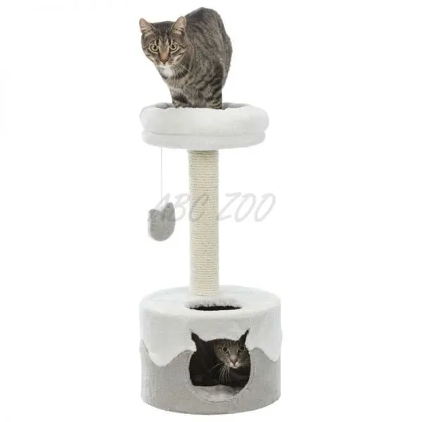Post de zgâriere pentru pisici cu loc de odihnă și cușcă pentru pisici de culoare alb-gri.