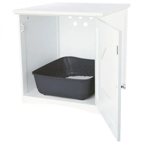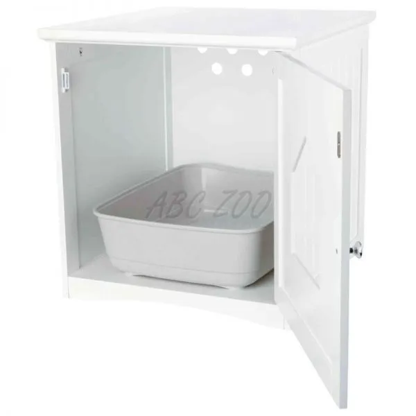 Căsuța albă din lemn servește ca o casă pentru a ascunde toaleta pisicii.