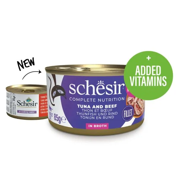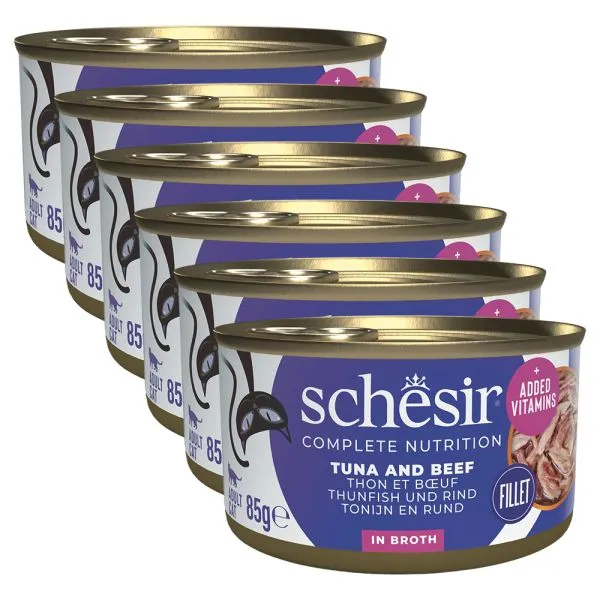 Schesir cat ton și vită cu orez în suc propiu 6 x 85 g