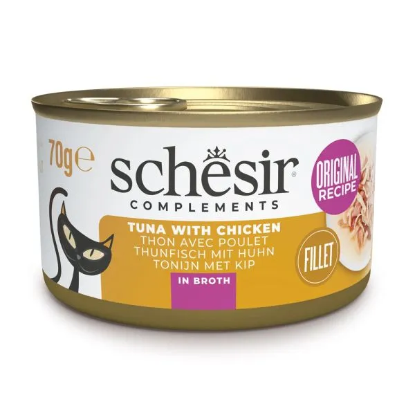 Schesir este o hrană delicioasă la conservă pentru pisicile adulte, plină de ton și pui în suc propriu.