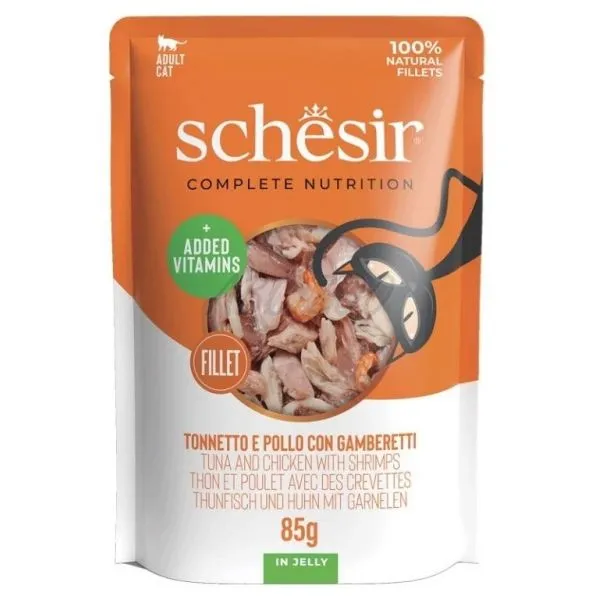 Pisica Schesir – Filete de ton și pui cu creveți, este o mâncare delicioasă sub formă de bucăți întregi de ton și piept de pui, completate cu creveți gustoși.