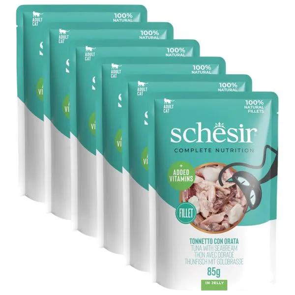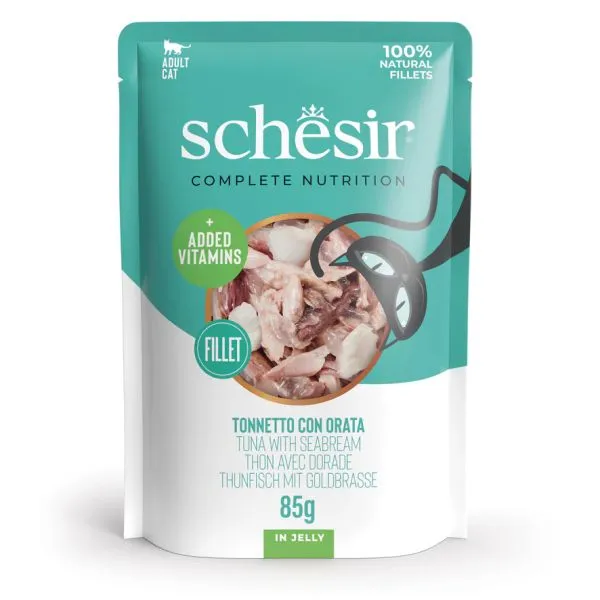 Pisica Schesir - Ton cu dorada este o porție de mâncare delicioasă sub formă de bucăți întregi de ton și dorada, completate cu orez sănătos.